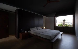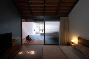 Trong bố cục nhà ở truyền thống Việt Nam, khoảng sân luôn đóng vai trò không gian trung gian – nơi kết nối giữa con người với tự nhiên, giữa các thành viên trong gia đình. Hình ảnh này cũng được tái hiện ngay tại tầng một, phía trước phòng ngủ.