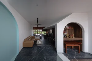 Toàn bộ không gian sinh hoạt chung gồm phòng khách, bếp – ăn và phòng thờ nằm liên thông trên một mặt sàn.