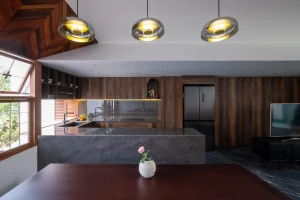 Khu bếp – ăn đặt cạnh cửa sổ, khác biệt so với cách bố trí thông thường luôn ưu tiên vị trí này cho khu tiếp khách.