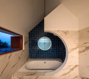 Phòng vệ sinh với bồn tắm nằm để gia tăng yếu tố thư giãn.