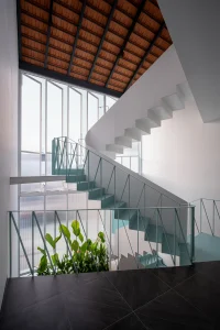 Cây xanh đặt xen kẽ ở các vị trí, từ cầu thang, hành lang, xuyên suốt các tầng.