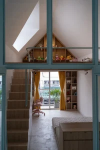 Phòng ngủ con được thiết kế như một ngôi nhà nhỏ, với phần mái nhọn và gác lửng.