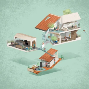 Hệ thống này được xếp chồng lên nhau theo chiều đứng và kết nối qua khoảng không rộng mở phía sau. Những chức năng chung, thay vì khép kín bên trong thì được tổ chức bên ngoài, nhằm tăng sự thông thoáng và khả năng tương tác giữa các thành viên.