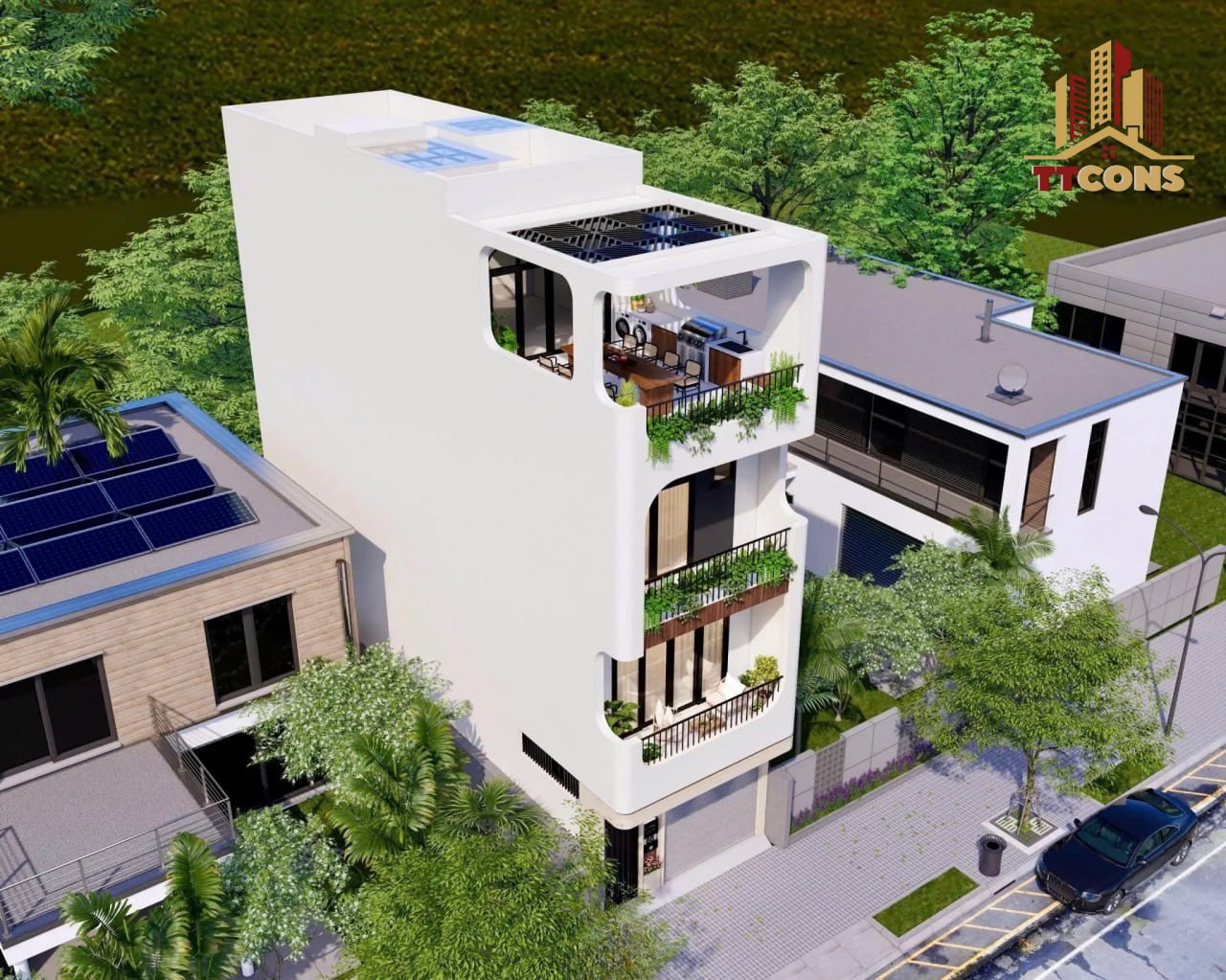 Các ban công được giật cấp, kết hợp với lan can kính hoặc sắt phun sơn tĩnh điện tạo nên điểm nhấn mềm mại giữa các khối kiến trúc cứng. Những mảng tường được ốp đá hoặc gỗ nhựa ngoài trời không chỉ gia tăng tính thẩm mỹ mà còn giúp bề mặt bền đẹp theo thời gian.