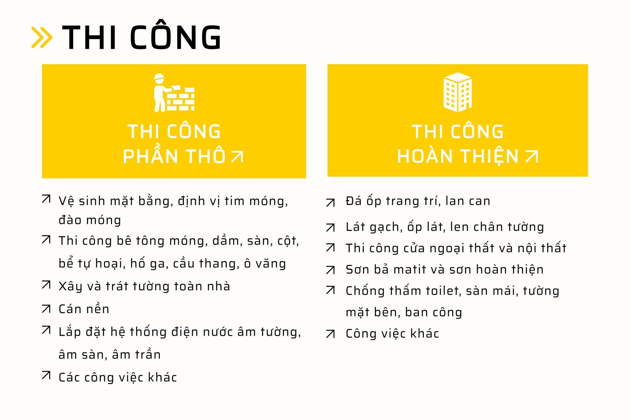 - Thi công phần thô: móng, cột, dầm, sàn, tường, mái